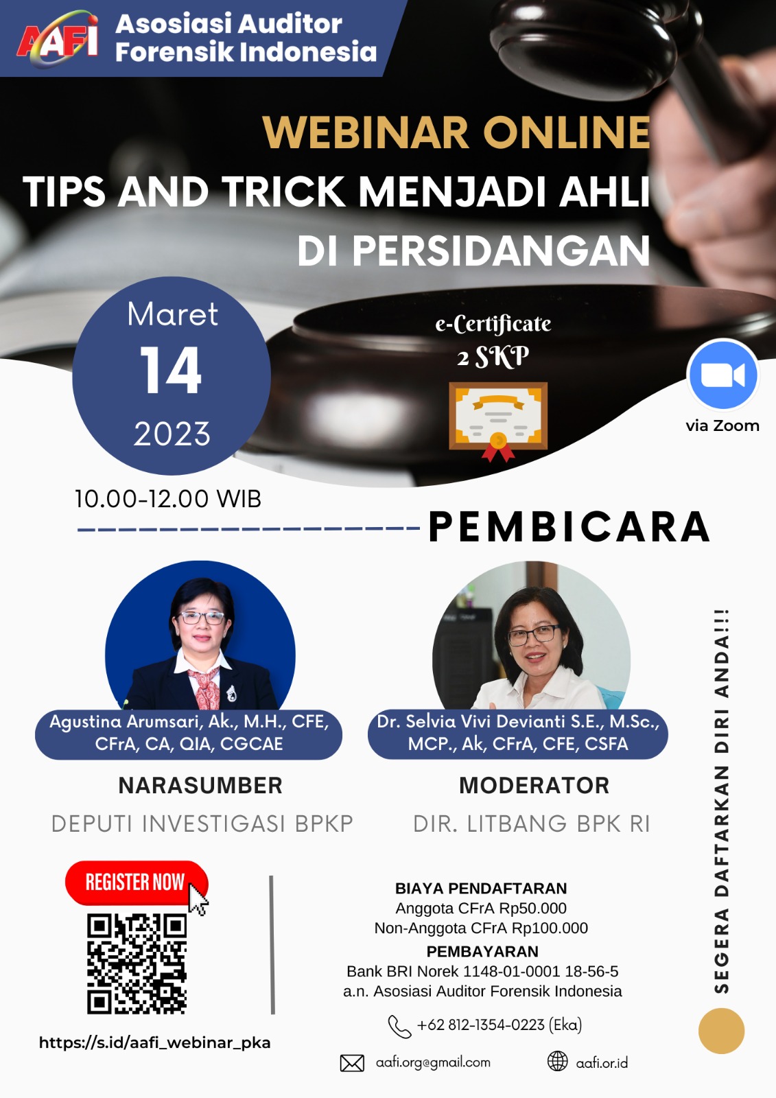 Asosiasi Forensik Auditor Indonesia (AAFI SENAMAY) mengundang Bapak/Ibu dalam Webinar Online dengan Tema "TIPS AND TRICKS MENJADI AHLI DI PERSIDANGAN"