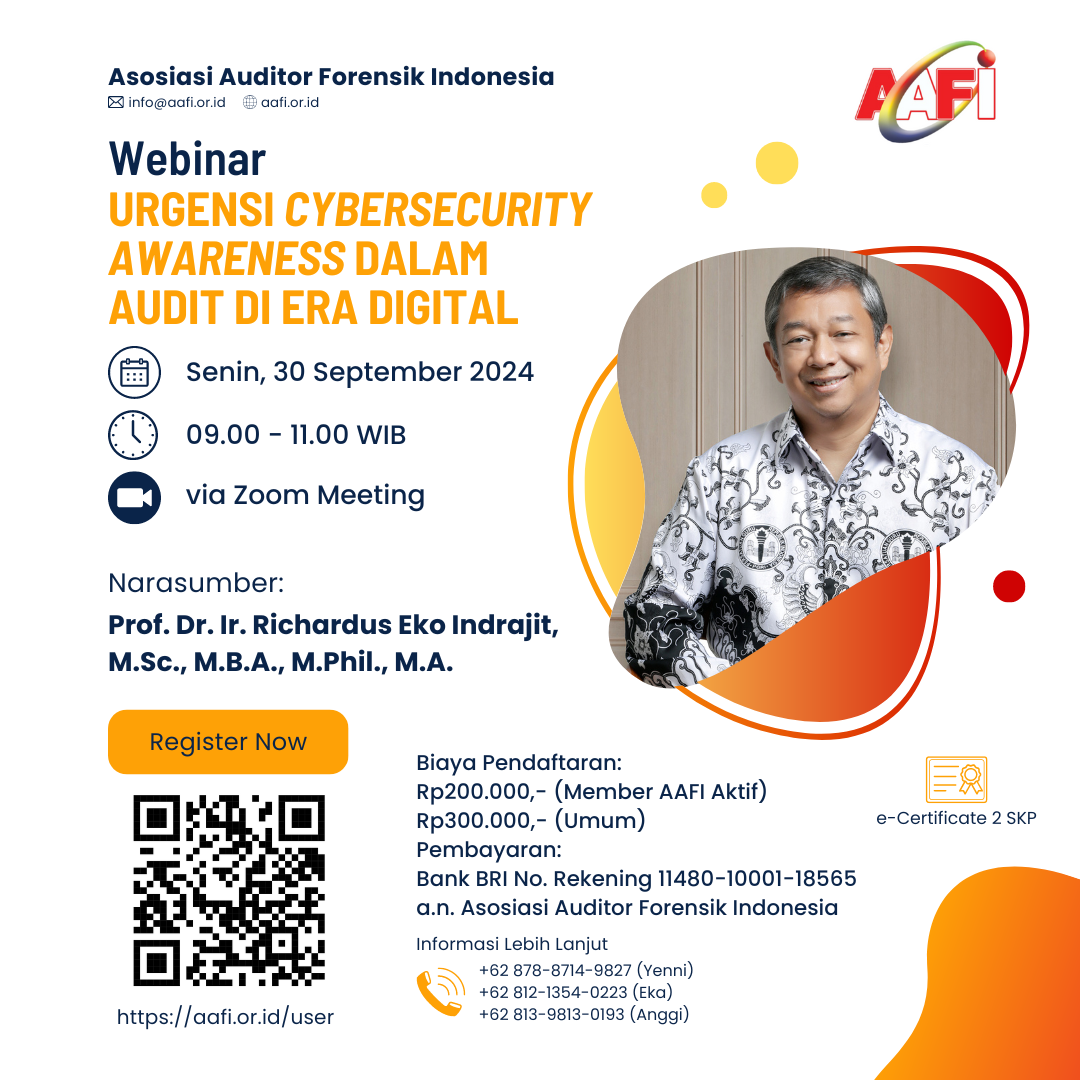 Asosiasi Auditor Forensik Indonesia Senamay (AAFI SENAMAY) mengundang Bapak/Ibu dalam Webinar Online dengan Tema: Urgensi Cybersecurity Awareness dalam Audit di Era Digital