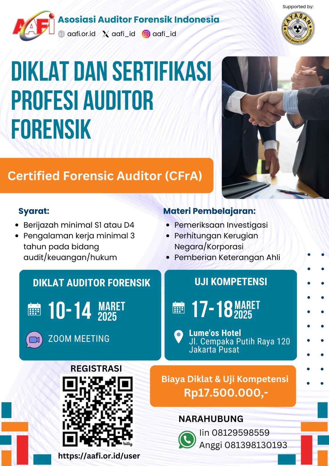 Asosiasi Auditor Forensik Indonesia Senamay (AAFI SENAMAY), dengan dukungan dari Yayasan Cakra Bhakti Santosha, kembali mengadakan Diklat dan Sertifikasi Profesi Auditor Forensik dengan gelar Certified Forensic Auditor (CFrA). Program ini bertujuan untuk meningkatkan kompetensi para auditor dalam bidang audit investigatif dan forensik guna mendukung upaya pemberantasan tindak pidana keuangan dan korupsi.